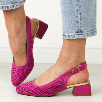 są idealnym wyborem na ciepłe wiosenne i letnie dni oraz na różnego rodzaju okazje. Ich cholewka wykonana z materiału zamszopodobnego nadaje im delikatny i elegancki wygląd. Zapinane na sprzączkę, czółenka bez pięty prezentują się nowocześnie i stylowo.