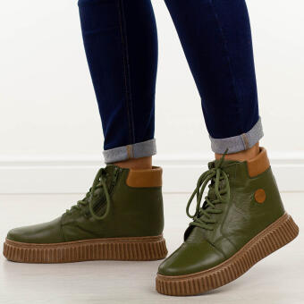 Khaki botki skórzane damskie idealnie sprawdzą się w wielu stylizacjach: